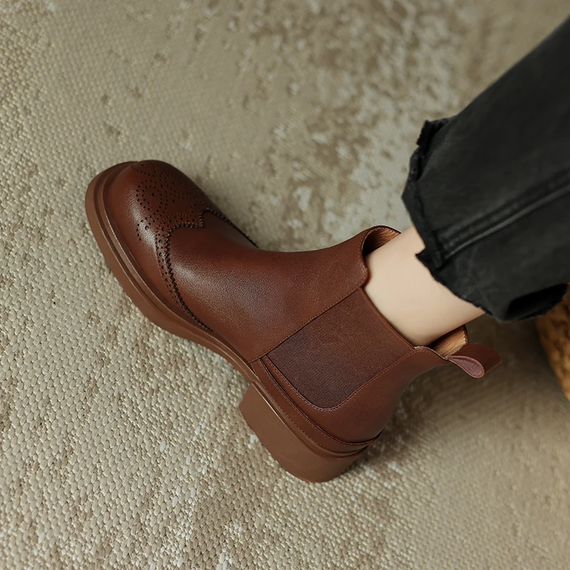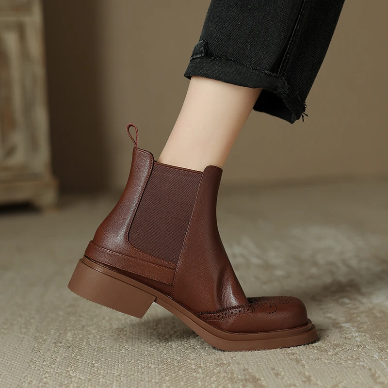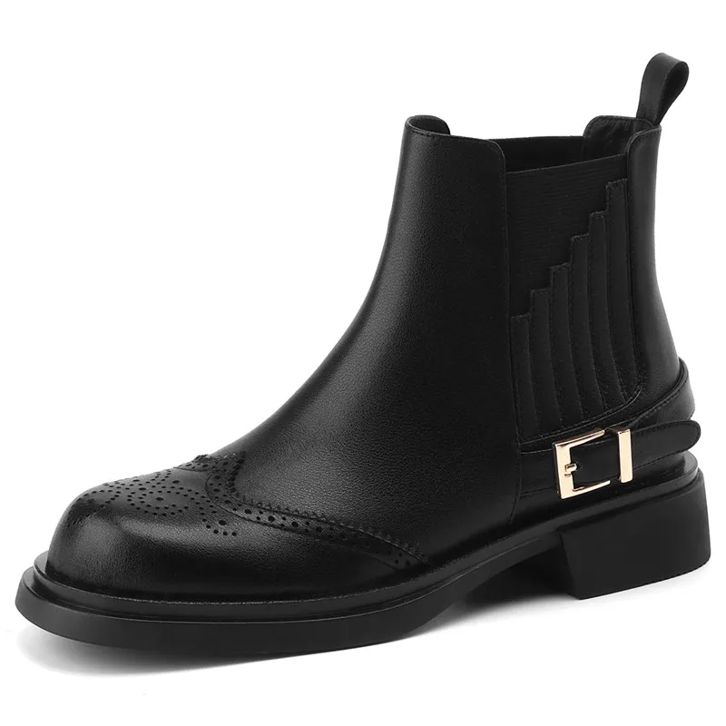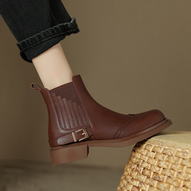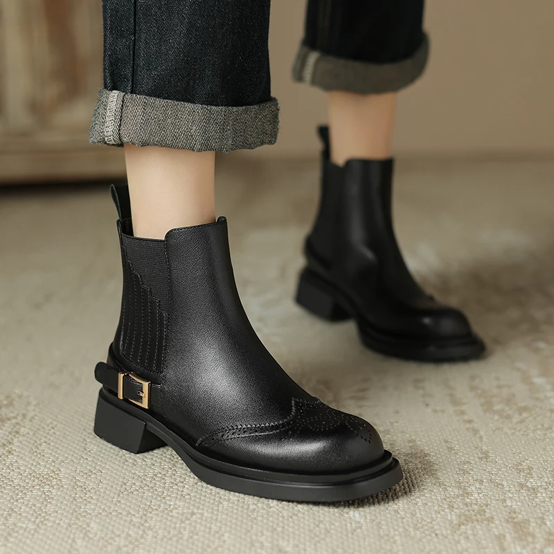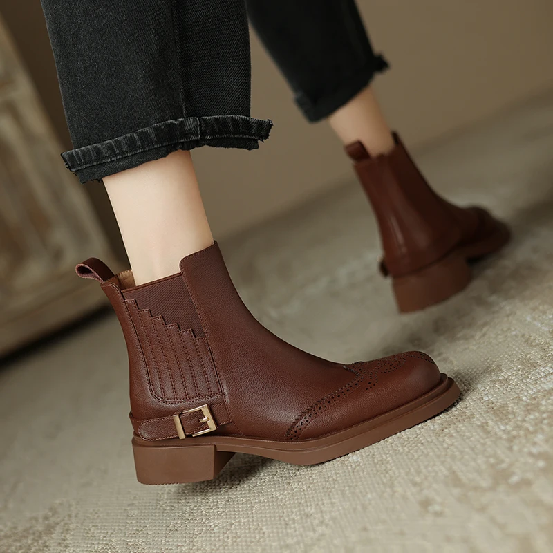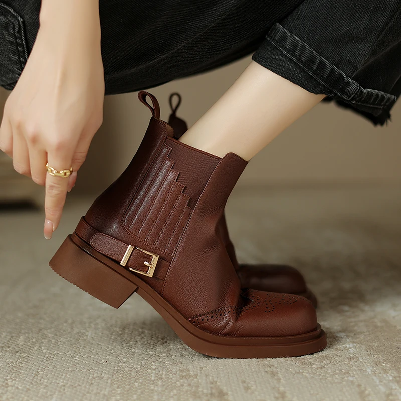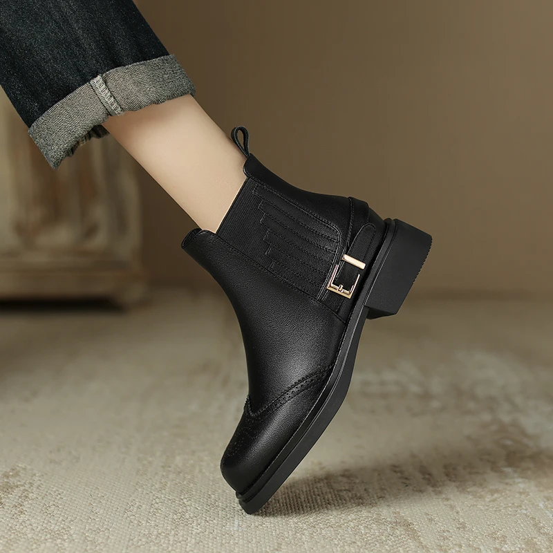 Retro Slip-On Ankle Chelsea Boots in Genuine Leather with Buckle and Square Heels