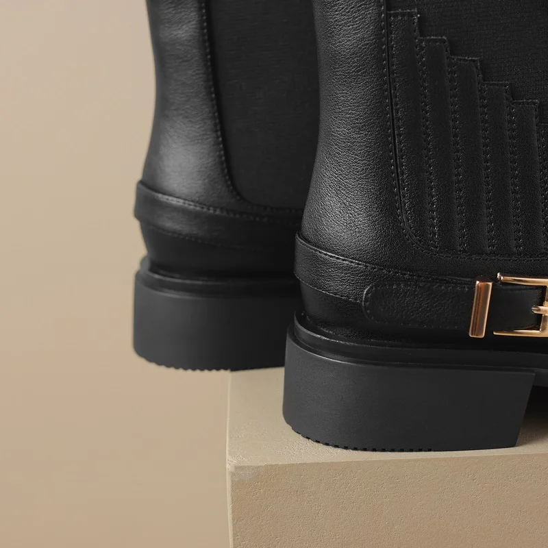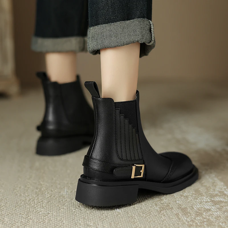 Step into style and comfort with our Retro Slip-On Ankle Chelsea Boots. Crafted from premium genuine cow leather, these boots combine sophistication with a trendy design that’s perfect for any occasion. Whether you’re heading to the office, out for a casual weekend, or looking to elevate your evening attire, these boots are your go-to choice. The slip-on design ensures effortless wear, while the chic buckle detail adds a distinctive touch to your ensemble.