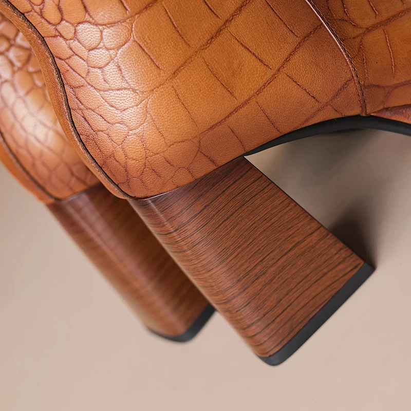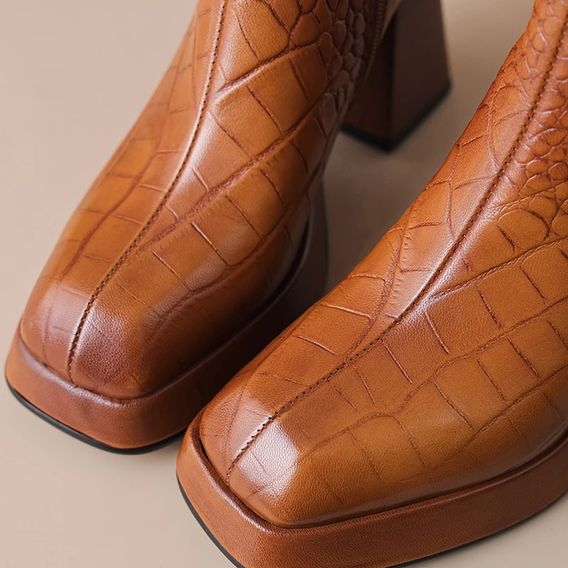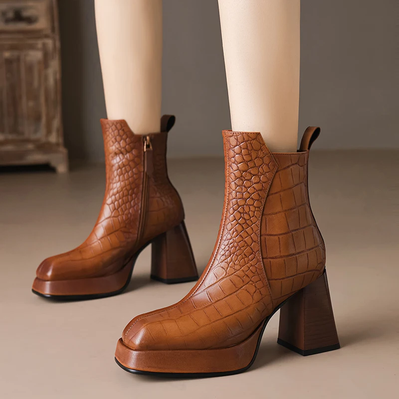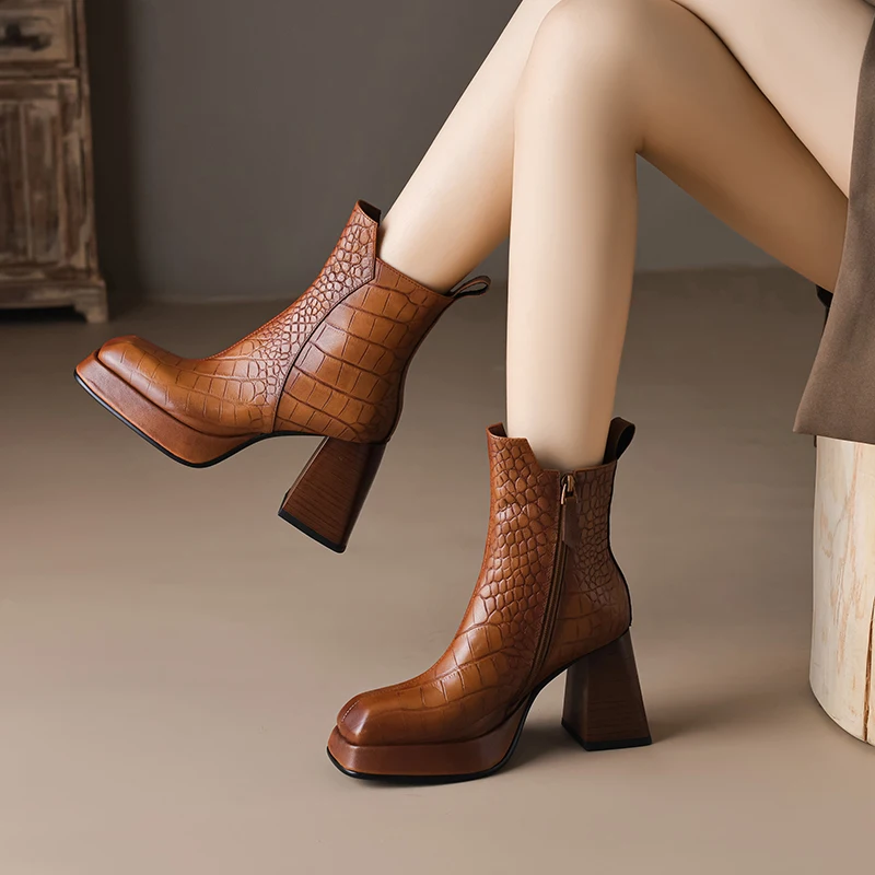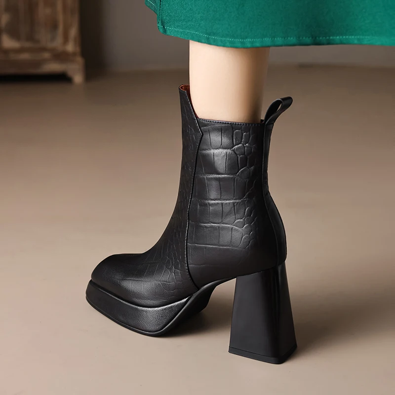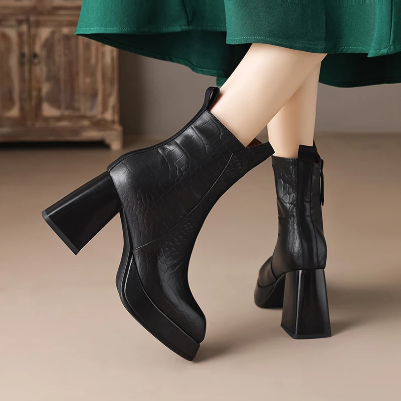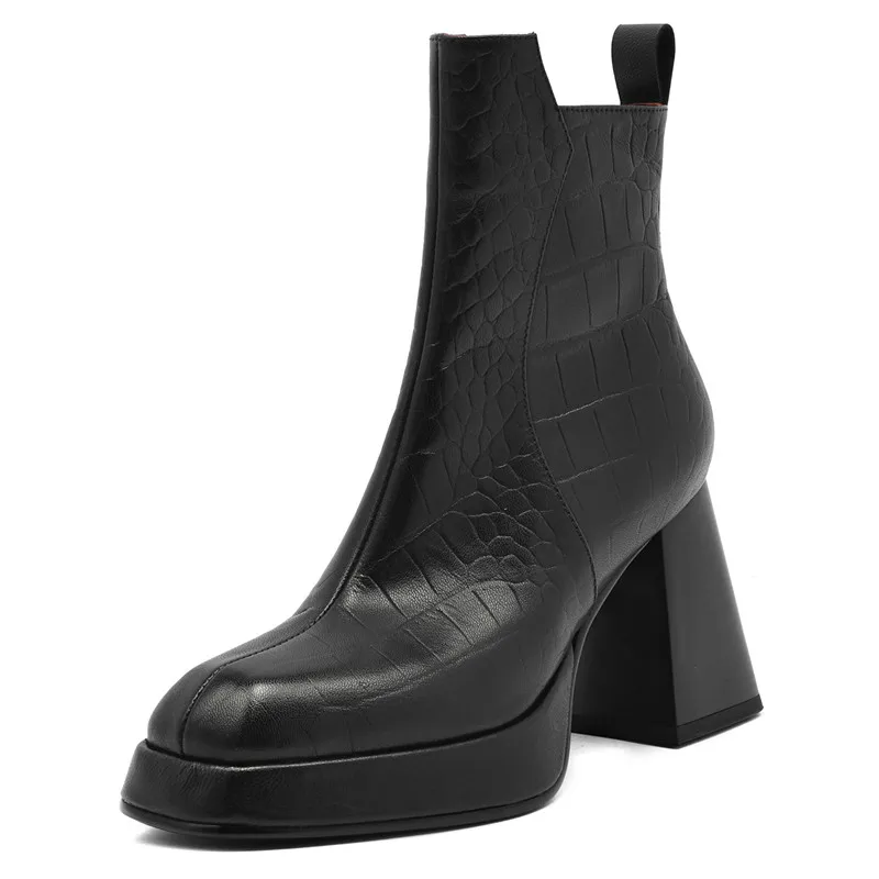 Sheepskin leather zipper ankle boots with thick heels