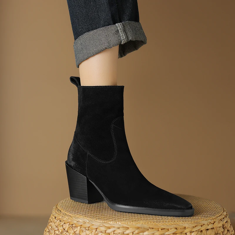 Square toe zipper ankle boots with high heels in suede leather