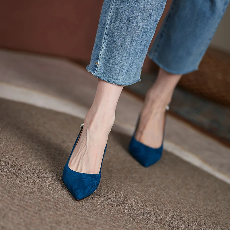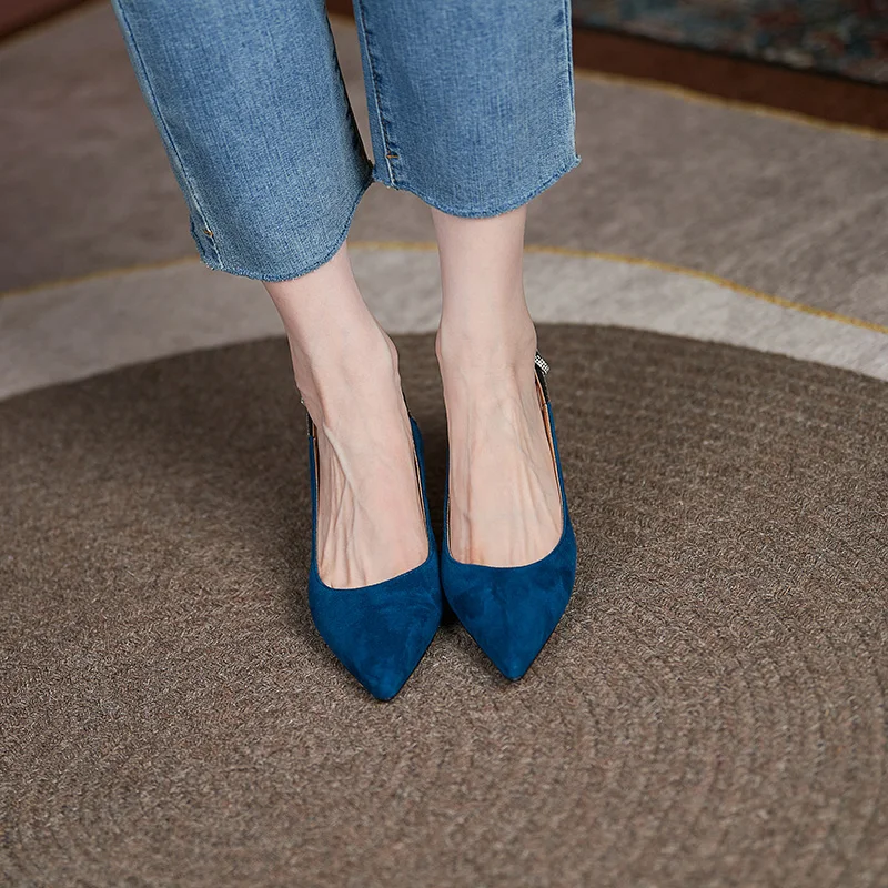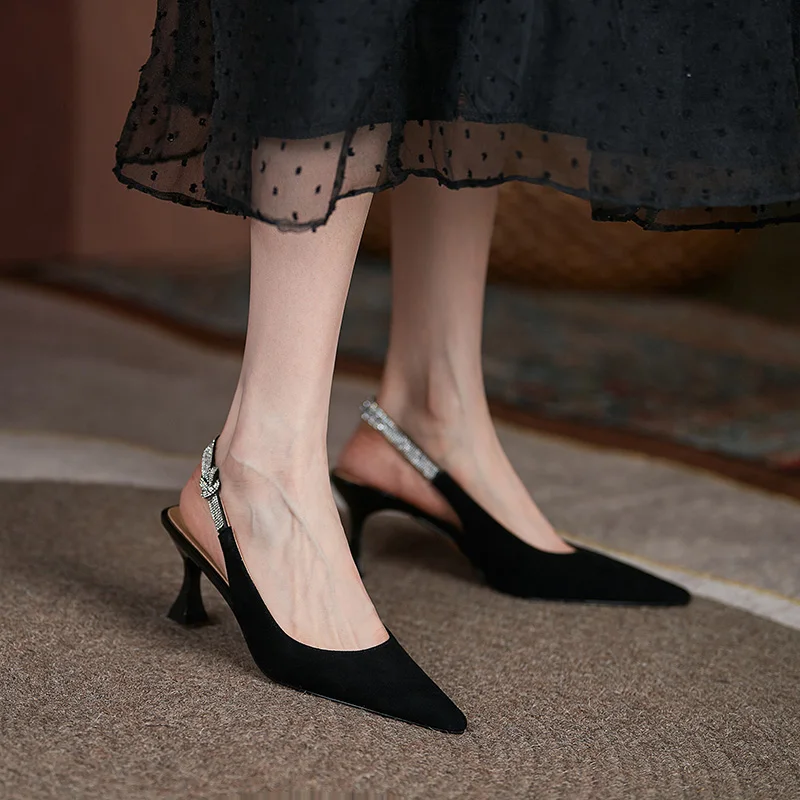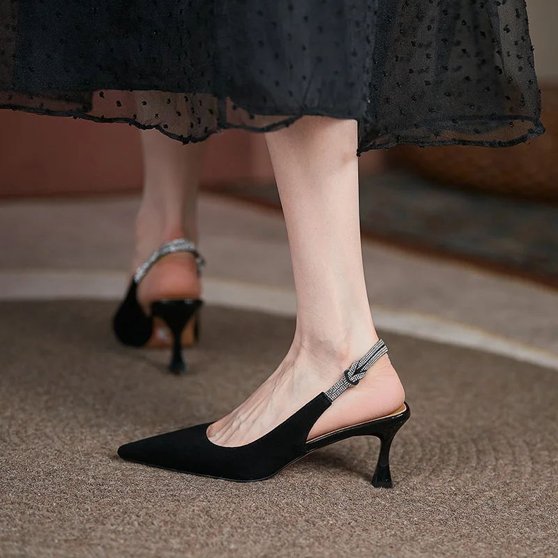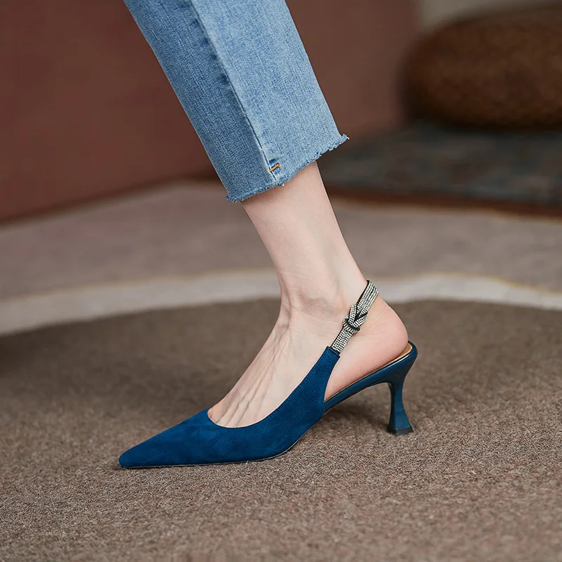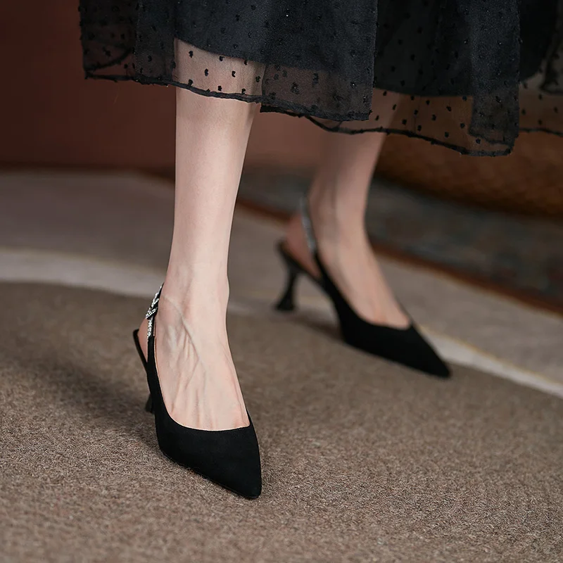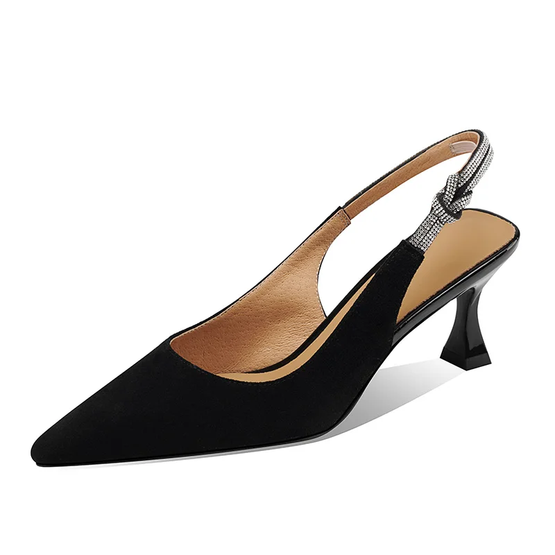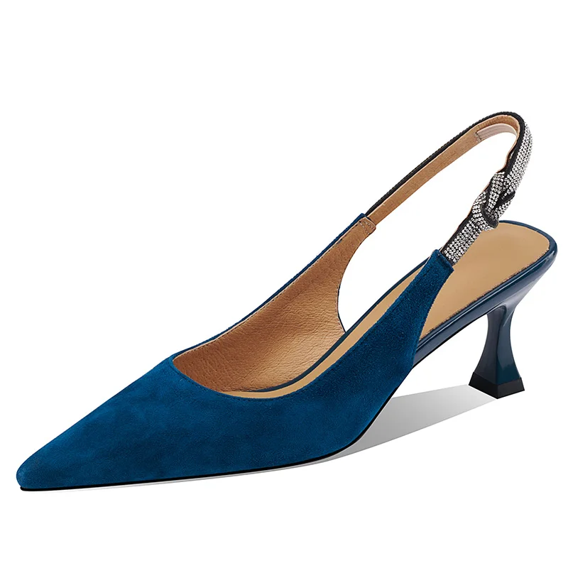 Step into elegance with our stunning Suede Slingback High Heels. Designed for the modern woman who values both comfort and style, these heels are perfect for any occasion, be it a party, a formal event, or a night out on the town. With their chic pointed toe and exquisite crystal accents, these heels not only enhance your outfit but also provide a flattering silhouette that you’ll love.