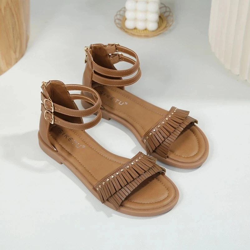 Tassel back zipper flat roman sandals