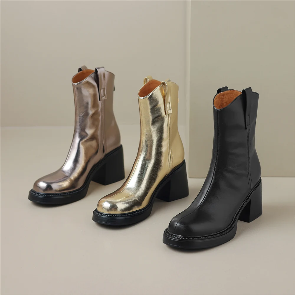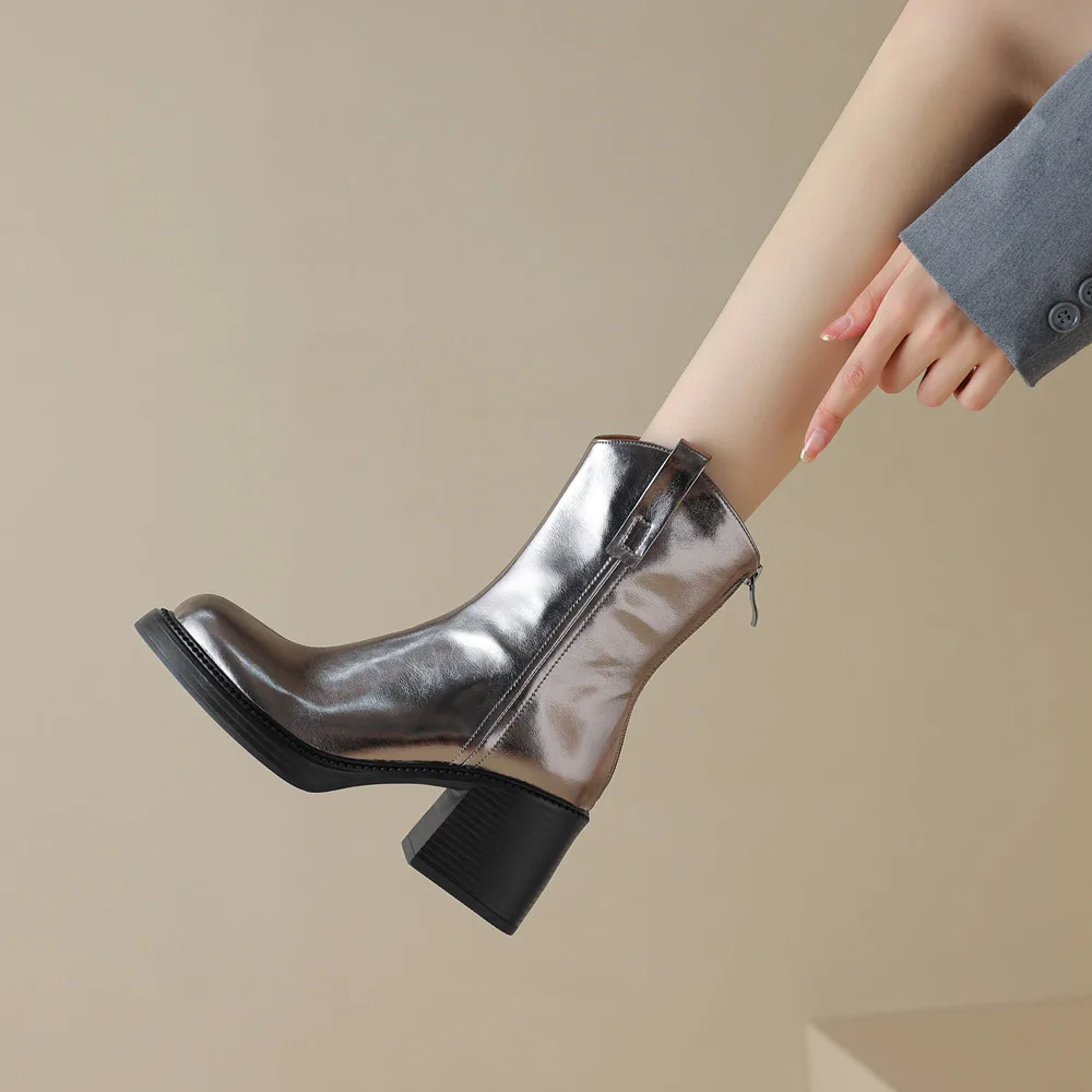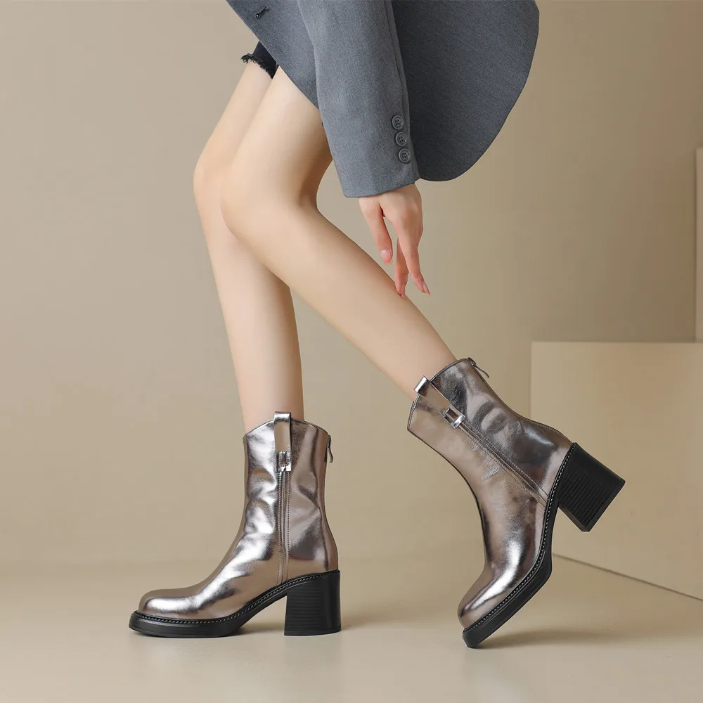 Step into style and comfort this winter with our stunning Thick High Heel Ankle Boots. Crafted from premium genuine cow leather, these boots are designed to elevate your look while providing unparalleled support and durability. The chic back zipper not only adds a touch of elegance but also ensures easy on-and-off wear. Whether you’re headed to the office or a night out, these boots are the perfect blend of sophistication and practicality.