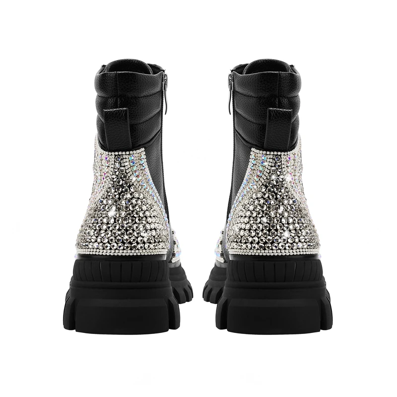 Thick soled high-heeled lace-up short boots with diamond buckle