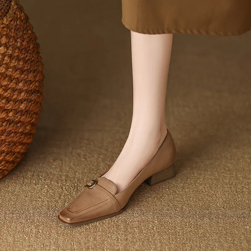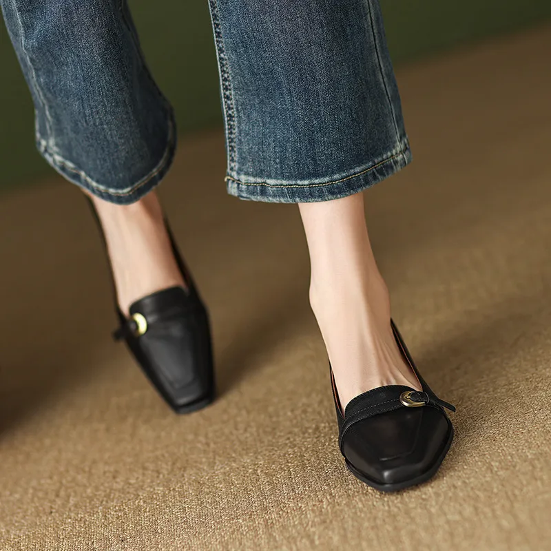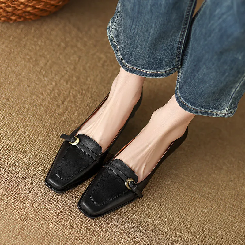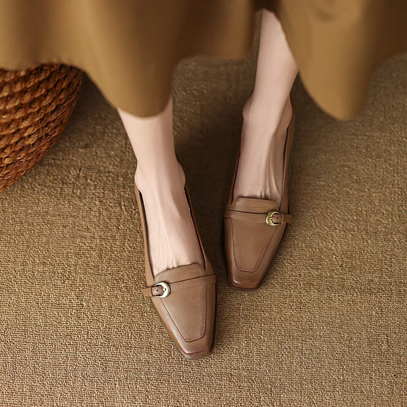 Vintage genuine leather low heel pumps with buckle