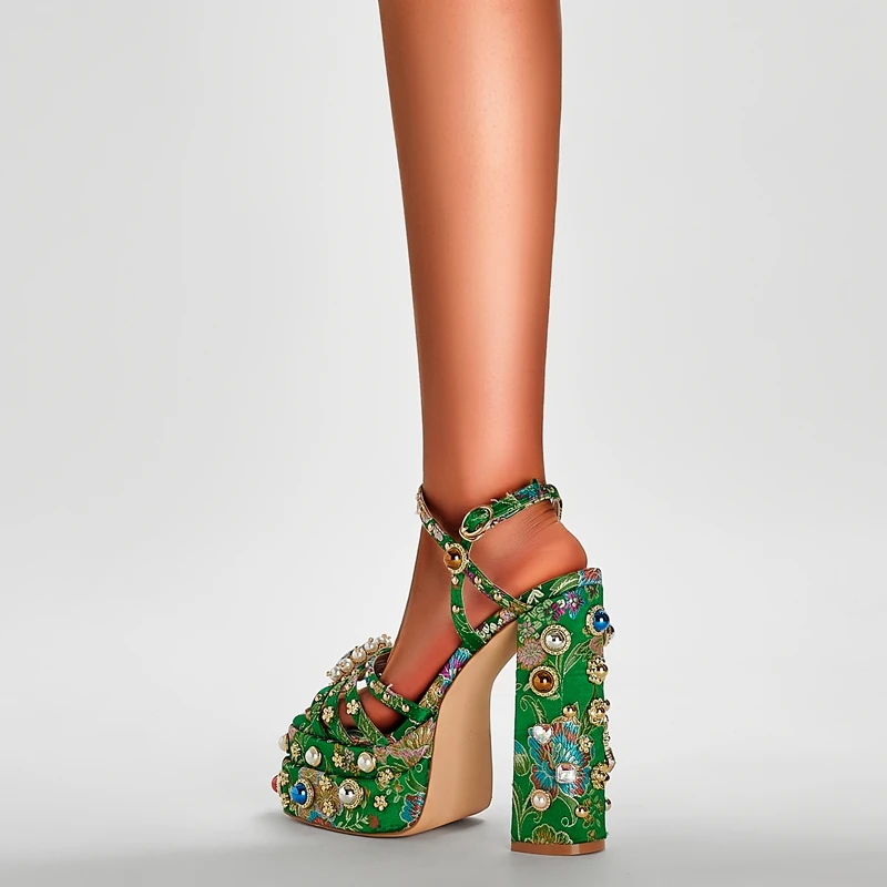 Waterproof Platform High Heel Sandals with Pearl Rivets and Flowers