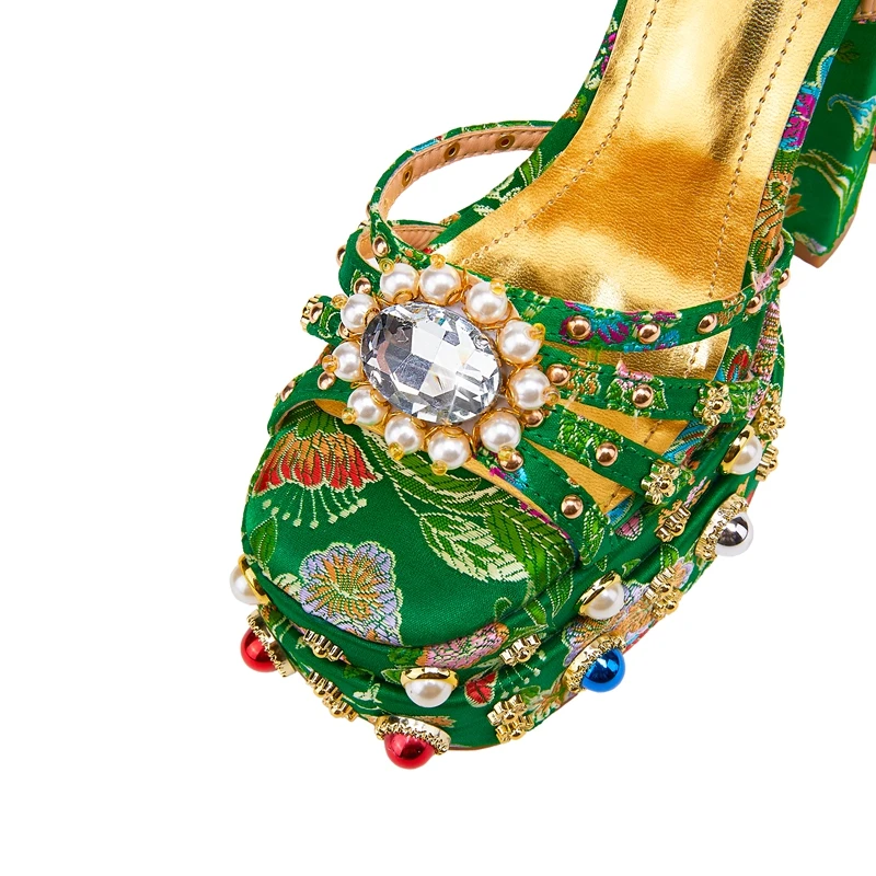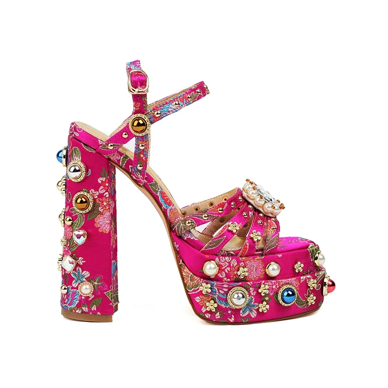 Waterproof platform high heel sandals with pearl rivets and flowers