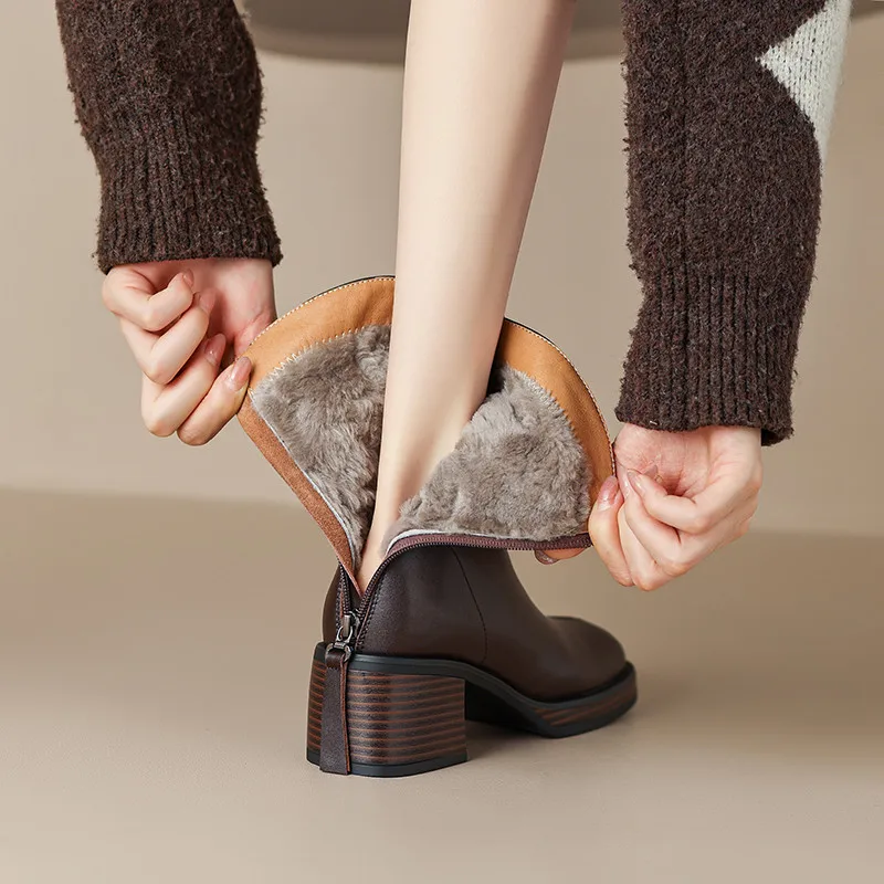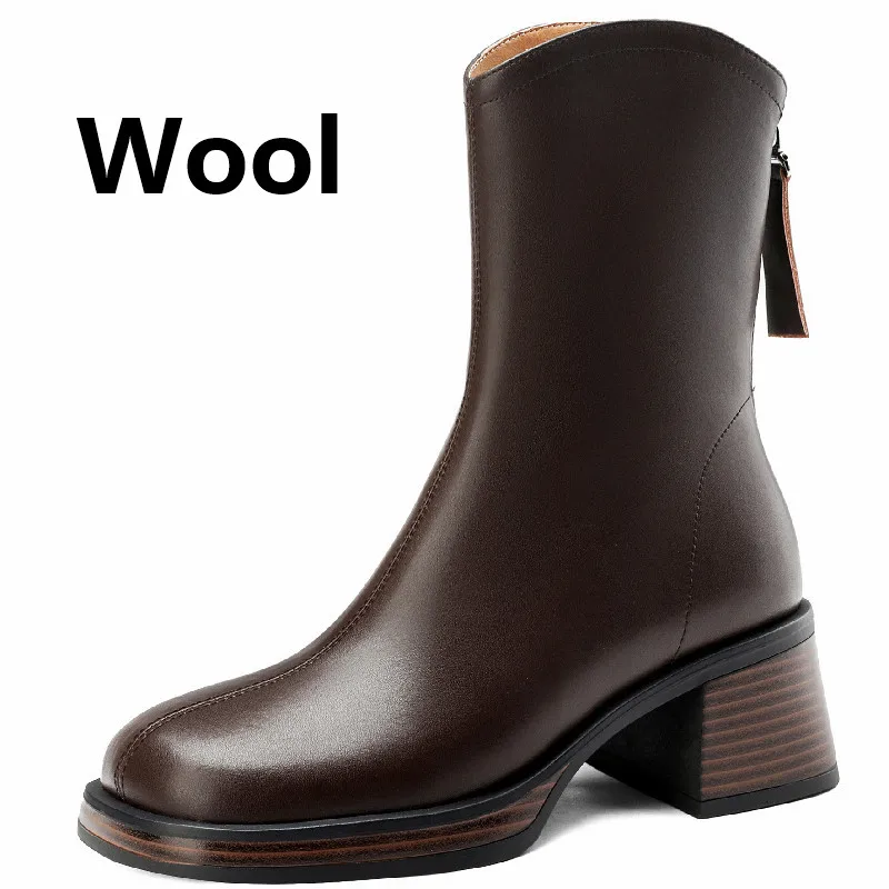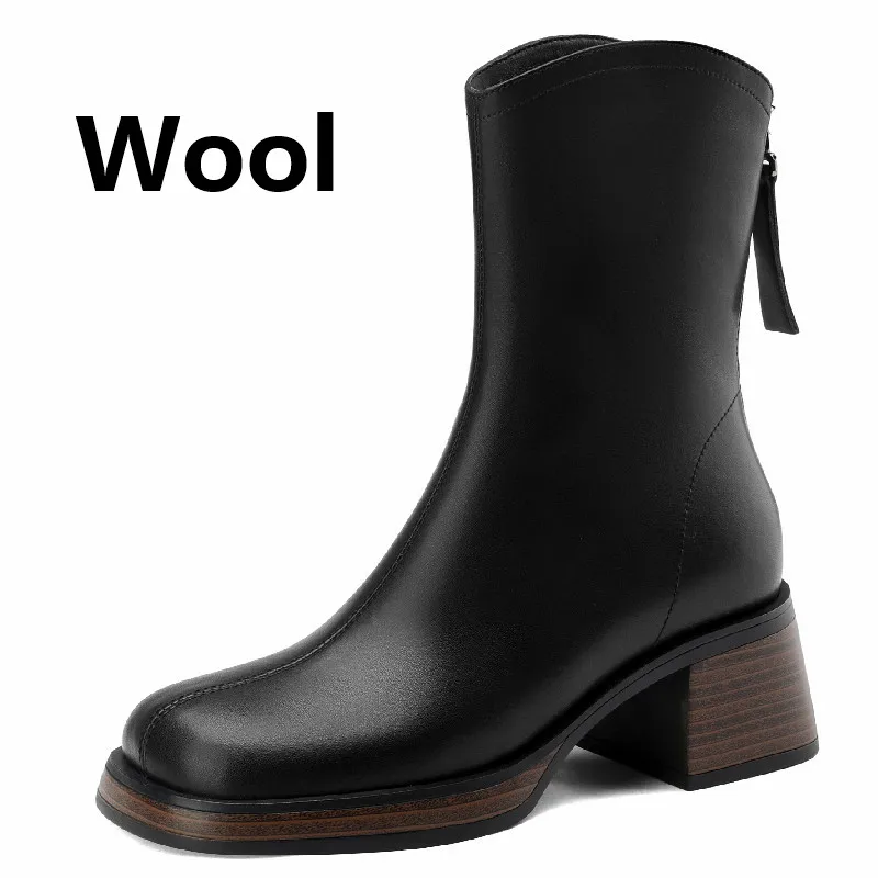 Wool Winter Ankle Boots with Thick Heels and Zipper